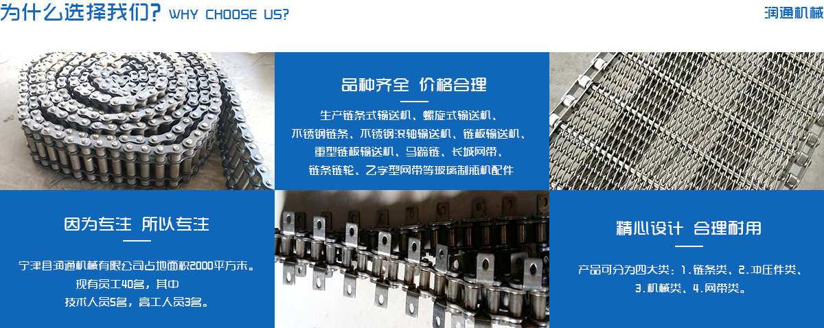 生產(chǎn)鏈條式輸送機、螺旋式輸送機、不銹鋼鏈條、不銹鋼滾軸輸送機、鏈板輸送機、重型鏈板輸送機、馬蹄鏈、長城網(wǎng)帶、鏈條鏈輪、乙字型網(wǎng)帶等玻璃制瓶機配件,食品機械配件及各種網(wǎng)帶的專業(yè)廠家 ,多年來產(chǎn)品暢銷各地玻璃廠和食品廠,在玻璃制品等行業(yè)中享有較高的聲譽。公司集摸具開發(fā)、機械設(shè)計生產(chǎn),銷售于一體的生產(chǎn)型企業(yè)。生產(chǎn)的自動化流水線金屬傳動網(wǎng)帶、鏈條等產(chǎn)品廣泛用于玻璃機械、食品機械、化纖機械、醫(yī)藥、電子、烘干機械、輪胎機械等行業(yè)。產(chǎn)品多銷往各個城市的機械廠、食品廠和一些涉及流水線或自動化設(shè)備的公司。